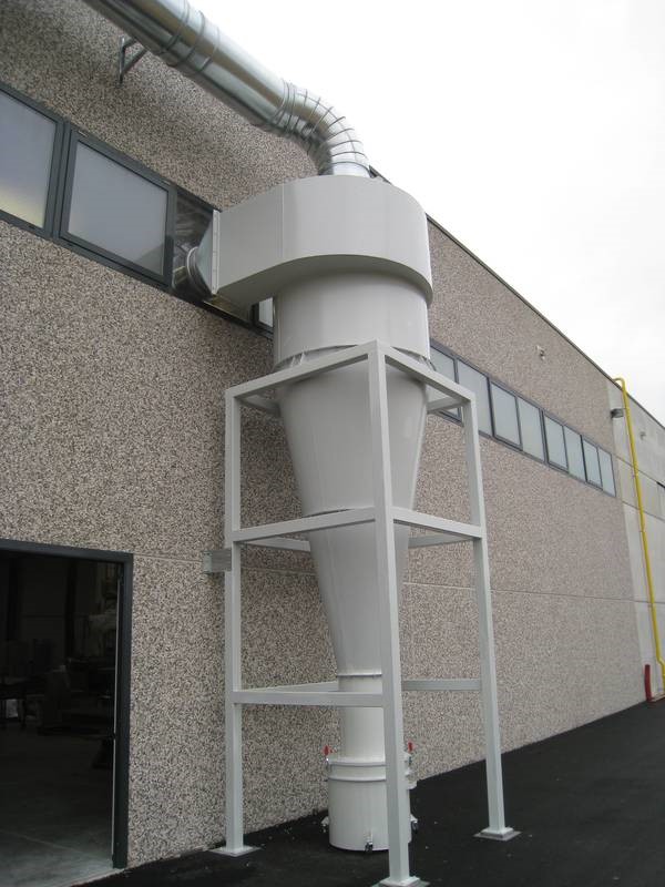 Ciclonul este un dispozitiv ce utilizeaza forta centrifuga pentru separarea particulelor de praf, rumegus sau aschii de lemn Datorită forţei centrifuge, particulele solide sunt antrenate si se lipesc de mantaua interioara. Forma elicoidală a canalului de centrifugare determină ca, pe langa viteza tangentiala, sa se imprime particulelor si o viteza de coborare. După centrifugare, particolele intra in teava centrală a ciclonului, unde viteza ascendenta este mult mai redusa decat viteza de coborare in elementul de centrifugare. Din aceasta cauza, particulele solide, care după separare s-au lipit de manta, se vor scurge fara nici un impediment, intr-un sac / recipient sau deposit de stocare a rumegusului.